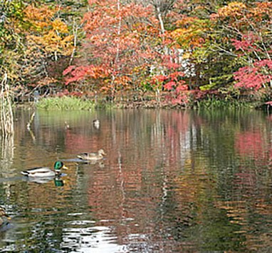 御膳水からの清冽な水を源とする、六本辻近くにある静かな池。「スワンレイク」とも呼ばれており、カラマツやモミジの木々に映え、とても落ち着いた雰囲気の場所です。