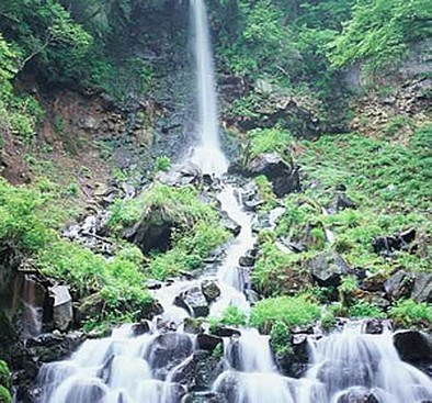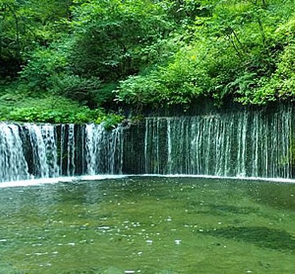 軽井沢では定番の観光スポット。大きさは高さ3m、幅70mくらいで川の水が流れ落ちている滝とは違い地下水が岩肌から湧き出して細い糸状に幾重も降り注ぎこの白糸の滝となっている。 水は透明度が高く、日本庭園の箱庭を感じさせる。